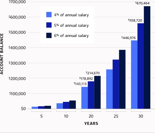 Note: This hypothetical example assumes a 7.8% return and a 2.5% salary increase each year. Investing in securities involves risk, and there is always the potential of losing money when you invest in securities.