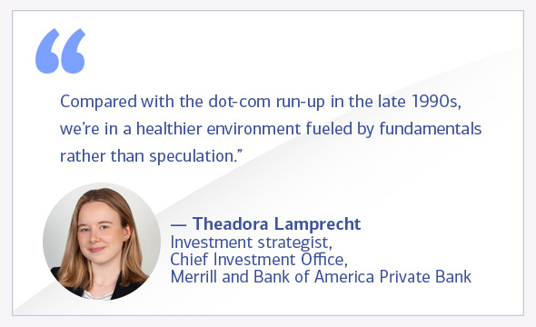 With artificial intelligence and other technologies propelling markets in 2025, some investors are wondering if there are parallels to the internet bubble of the late 1990s.Footnote 1 But the market landscape is not the same today, says Theadora Lamprecht, investment strategist for the Chief Investment Office (CIO), Merrill and Bank of America Private Bank.